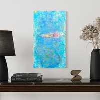 This abstract art has several layers of encaustic medium used to create highly textured and smooth areas. The sides are painted blue with visible drips. This piece measures approximately 23 inches tall, 13 inches wide, and 1 inch deep. Wire hanger on back for easy hanging.