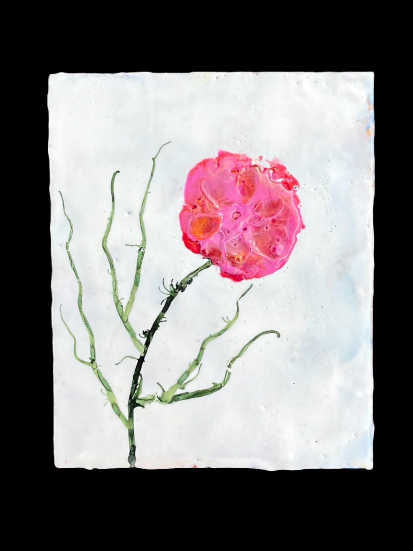 This piece is mostly smooth and the layers of wax have created depth. The sides are painted blue with some gold and white visible drips. This piece measures approximately 10.75 inches tall, 8.75 inches wide, and 0.75 inches deep. Wire hanger on back for easy hanging.