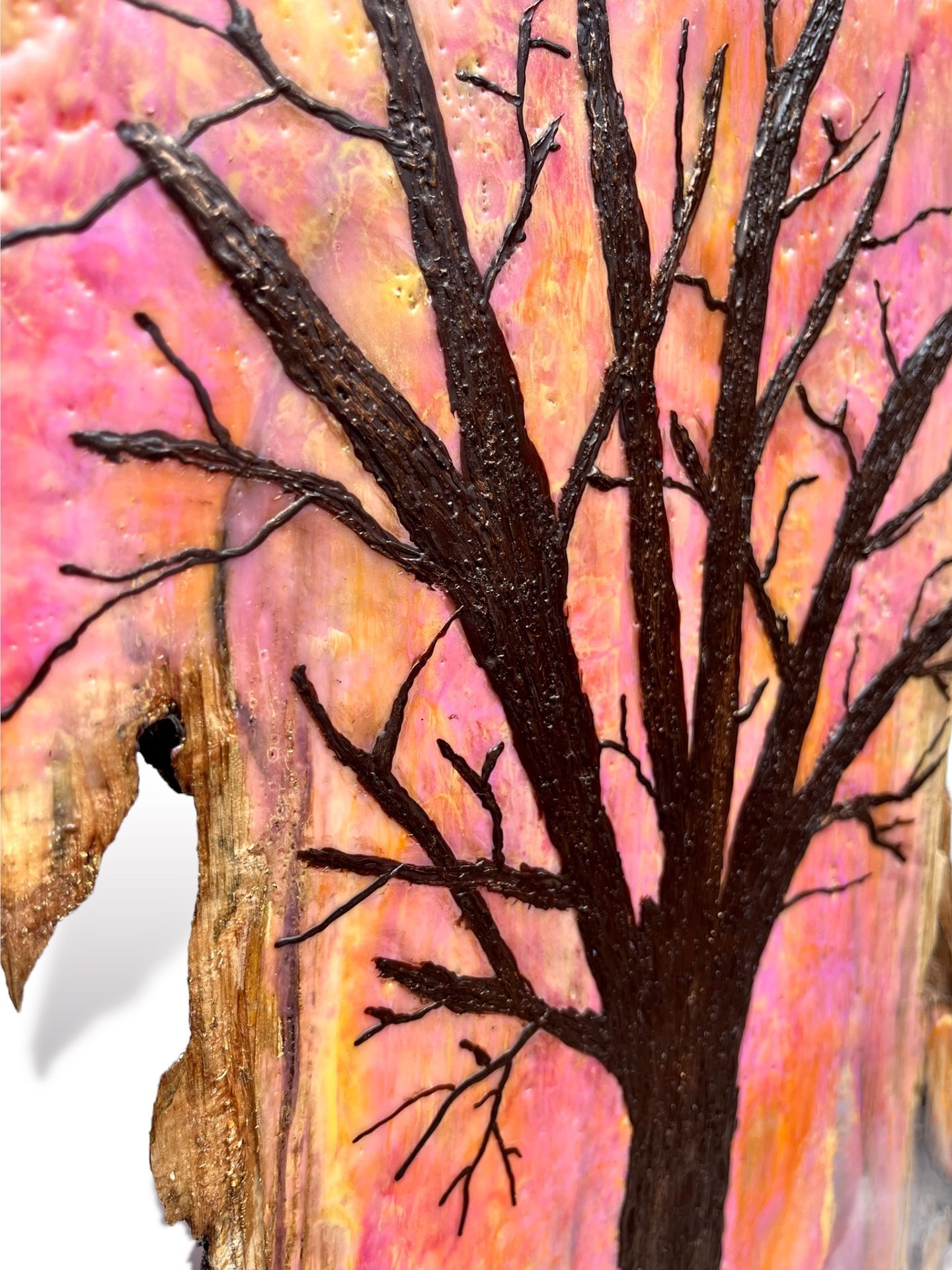 The wood used in this piece was salvaged from a local wood worker. The wood substrate has been reinforced with wood glue which creates a glossy finish on the bark.