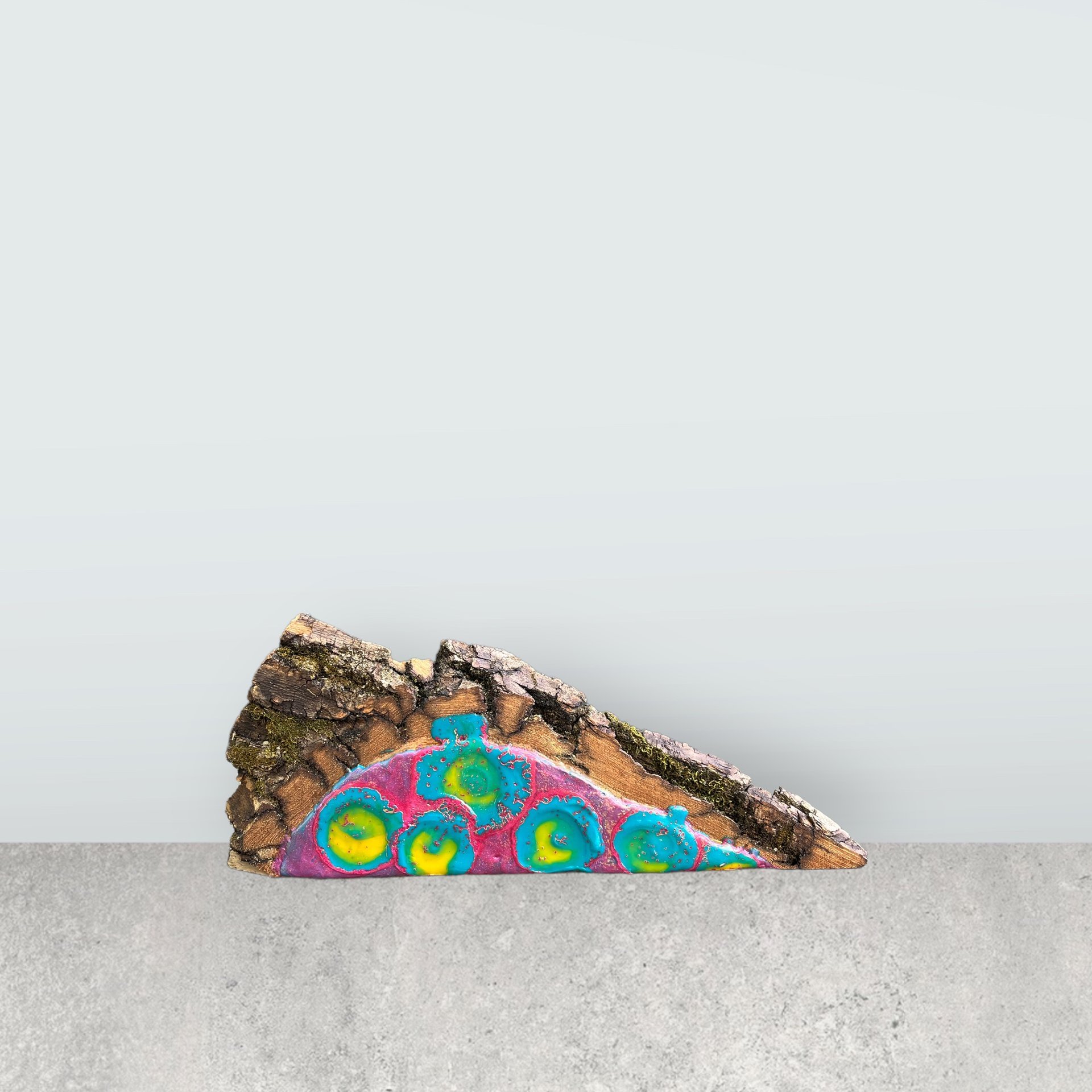 The background of this piece is smooth, while the blobs of color are textured. The live edge bark still has moss on it! This piece is irregularly shaped and measures approximately 5 inches tall, 13 inches wide, and 0.25 inches deep.